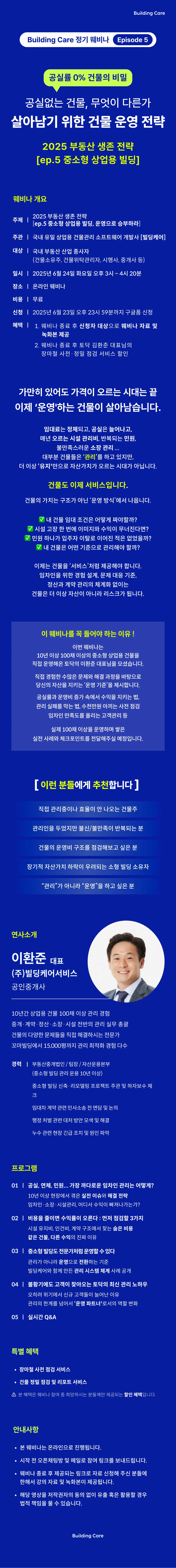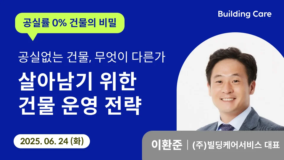많은 건물주분들께서 “공실률과 운영비가 증가하는 시대 속에서 내 건물의 자산가치와 수익을 지키는 법”에 대해 고민하고 계십니다. 이번 웨비나에서는 건물의 다양한 문제들은 직접 해결해본 경험이 있으신 주식회사 빌딩케어서비스의 이환준 대표님을 모셨습니다.